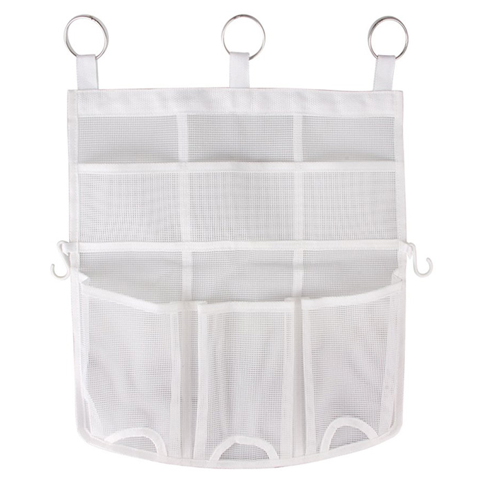Удобная подвесная конструкция может разместиться у вас в пенале либо на настенном крючке. Прочный органайзер выдерживает нагрузку до 5 кг. Есть большие отделения под крема и бальзамы, чуть меньше под расчески и маски и самые малые под инструменты для макияжа.